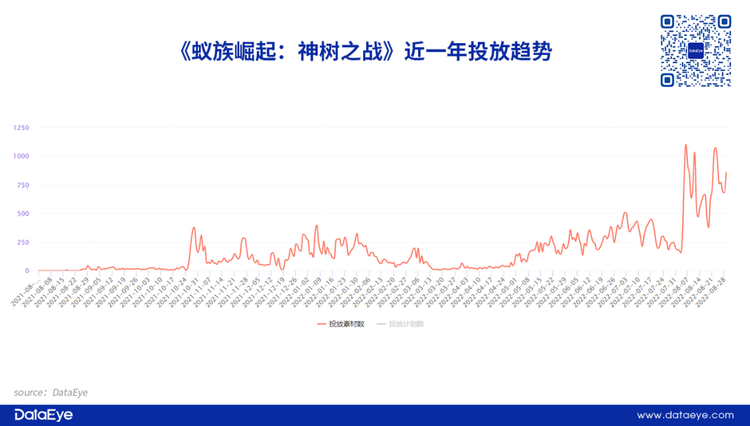 而在过去一年的时间内,《蚁族崛起:神树之战》投放相对“佛系”,但是从投放节点来看,该项目组侧重在寒暑假档期加大投放,特别在进入8月后整体投放量明显提高。