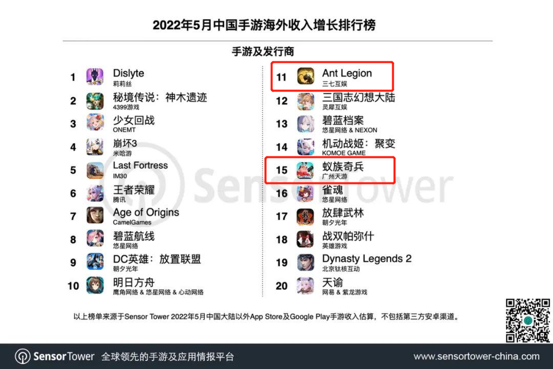 而三七互娱在欧美地区发行的《蚂蚁军团》和天游网络在中国台湾地区发行的《蚁族奇兵》(国内《蚁族崛起》中国台湾版本),均属于题材新产品。根据data.ai数据显示,两款蚂蚁题材新产品均进入了2022年5月海外收入增长排行榜,前者排名11,后者位居15名,整体表现出色。