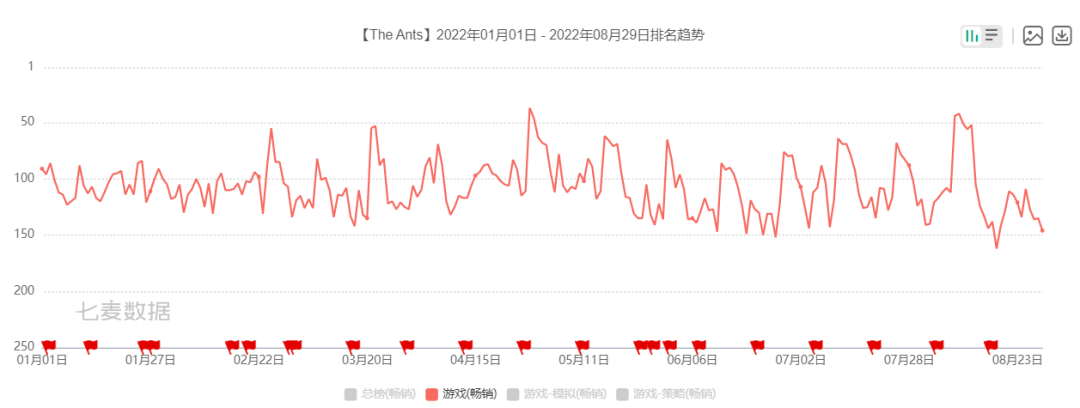 作为出海首款蚂蚁SLG,《小小蚁国》海外表现稍微突出。据data.ai预估收入数据显示,《小小蚁国》海外iOS端在今年全球累计收入接近700万美元。而海外上线一年之后,游戏依然稳定在日韩畅销榜前列,而在全球竞争最激烈的美国市场,《小小蚁国》今年以来在畅销榜从未跌出过200名以外。