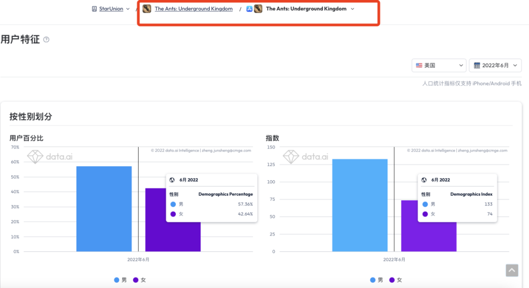 根据data.ai显示,《小小蚁国》海外版(The Ants: Underground Kingdom)25-44年龄层人群占比较高,约为47%。而男女比例来看,男性玩家占比更多,但相差并不算特别大。与国内相比,用户年龄层占比相仿,但女性玩家更能接受蚂蚁题材。