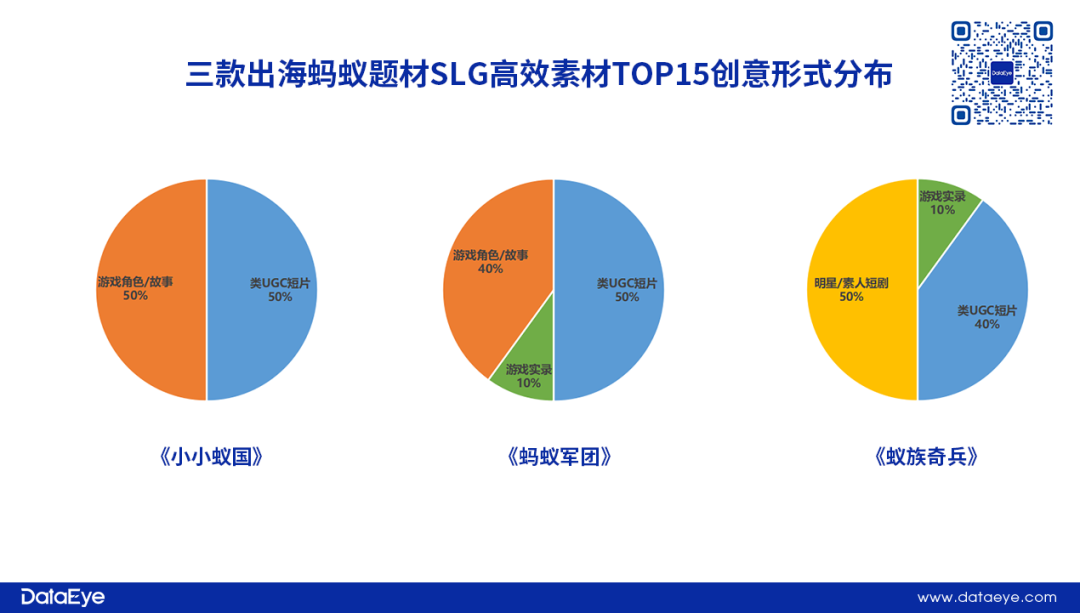 《小小蚁国》和《蚂蚁军团》的海外高效创意素材表现相对集中,重点通过游戏角色/故事和类UGC短片内容来突出游戏核心玩法,向玩家展现更多游戏内容。而《蚁族奇兵》更多利用明星/素人出演短剧,以丰富创意素材的戏剧感,同时让整个广告素材变得不那么冰冷。