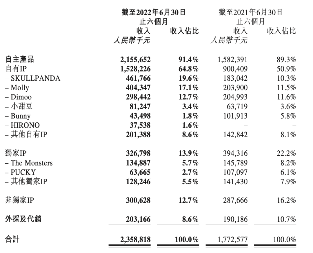 财报显示,2022年上半年,SKULLPANDA、MOLLY和DIMOO分別实现收入4.62亿元、4.04亿元和2.98亿元,同比分别增长了152.3%、98.3%和45.6%。其中,2022年1月推出的SKULLPANDA第五个系列夜之城,截至2022年6月30日单系列收入达到1.79亿元。