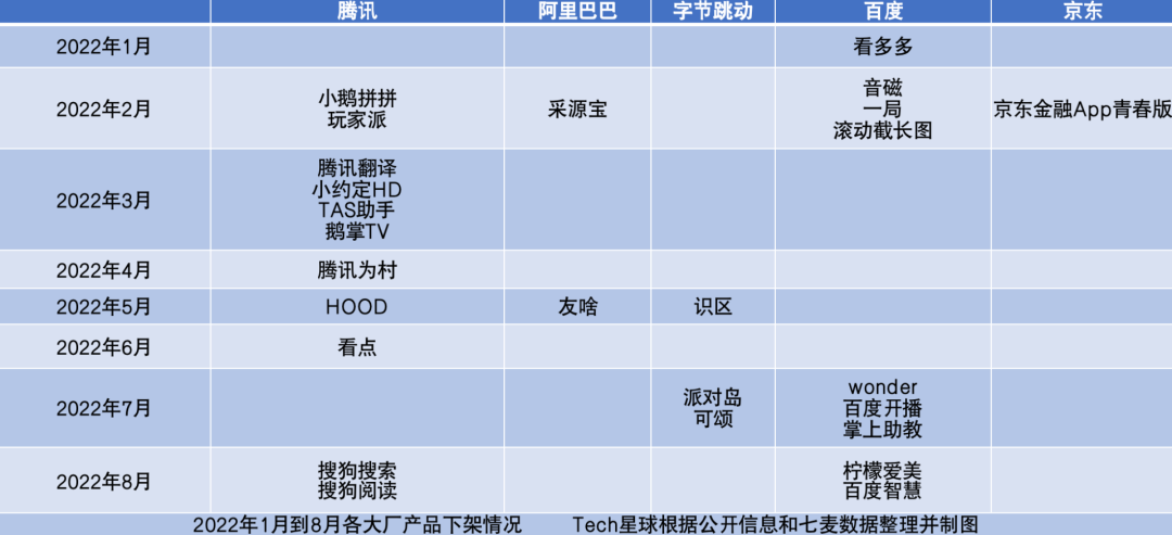 Tech星球综合七麦数据和公开信息梳理,据不完全统计,今年1月到8月,各互联网大厂下架的非游戏类产品就有20多款。