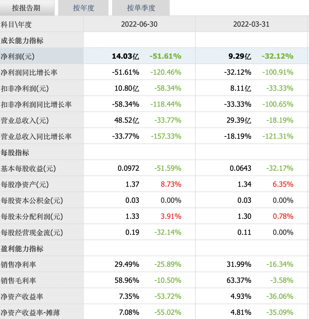 根据其半年报数据显示:2022H1录的营收45.82亿元,同比下滑33.77%,录的净利润14.31亿元,同比下滑50.92%;拆季度来看,Q1营收29.39亿元,同比下滑18.19%,Q2营收19.13亿元,同比下滑48.76%,Q2营收较Q1环比下滑34.9%;Q1净利润9.4亿元,Q2净利润4.91亿元,Q2净利润较Q1环比下滑47.7%;可以看出,营收、净利同比、环比均出现明显的下滑,且下滑幅度较大,成长能力衰退迹象明显。