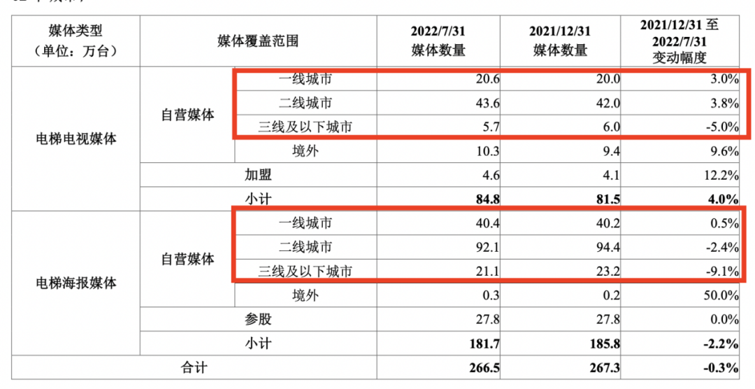 从其楼宇媒体的布局来看,主要集中在一二线等大型城市,三线及以下城市除了少量布局了一些海报媒体之外,可以说覆盖度并不高。