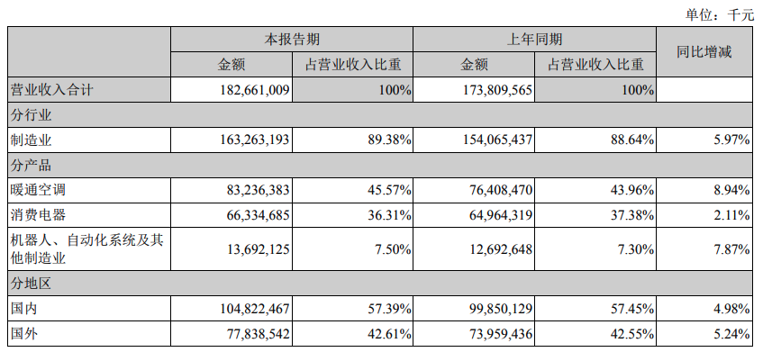 美的集团上半年的营收为1826.61亿元,同比增长5.09%;归母净利润159.95亿元,同比增长6.57%;基本每股收益2.34元。公司净利润增速与上年基本持平。