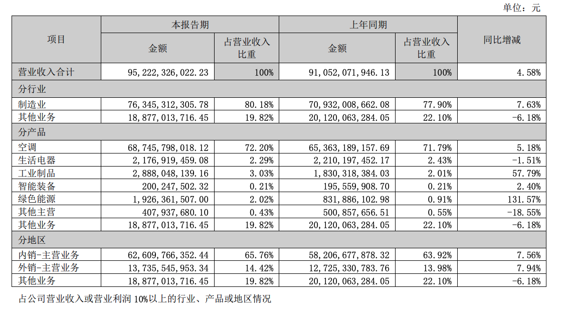 格力电器上半年实现营业收入952.22亿元,同比增长4.58%;归母净利润114.66亿元,同比增长21.25%;基本每股收益1.94元。公司营收净利增速相较去年有所放缓。