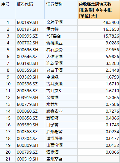 和经销商相比,金种子酒处于弱势地位,这在酒企中并不常见。一般来说,白酒企业的经销商较为弱势,因此行业普遍采取先款后货销售模式,而金种子酒则采取现款现货及赊销的销售政策,甚至对常年合作的经销商会给予一定赊销额度及赊销期,一般为1至6个月。这直接导致公司应收账款周转天数高达48.34天,位居整个申万白酒行业的“第一”。