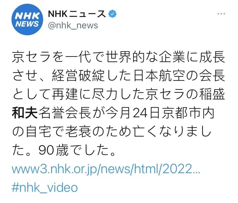 据NHK(日本广播协会)8月30日消息,著名企业家、京瓷名誉会长稻盛和夫去世,终年90岁。