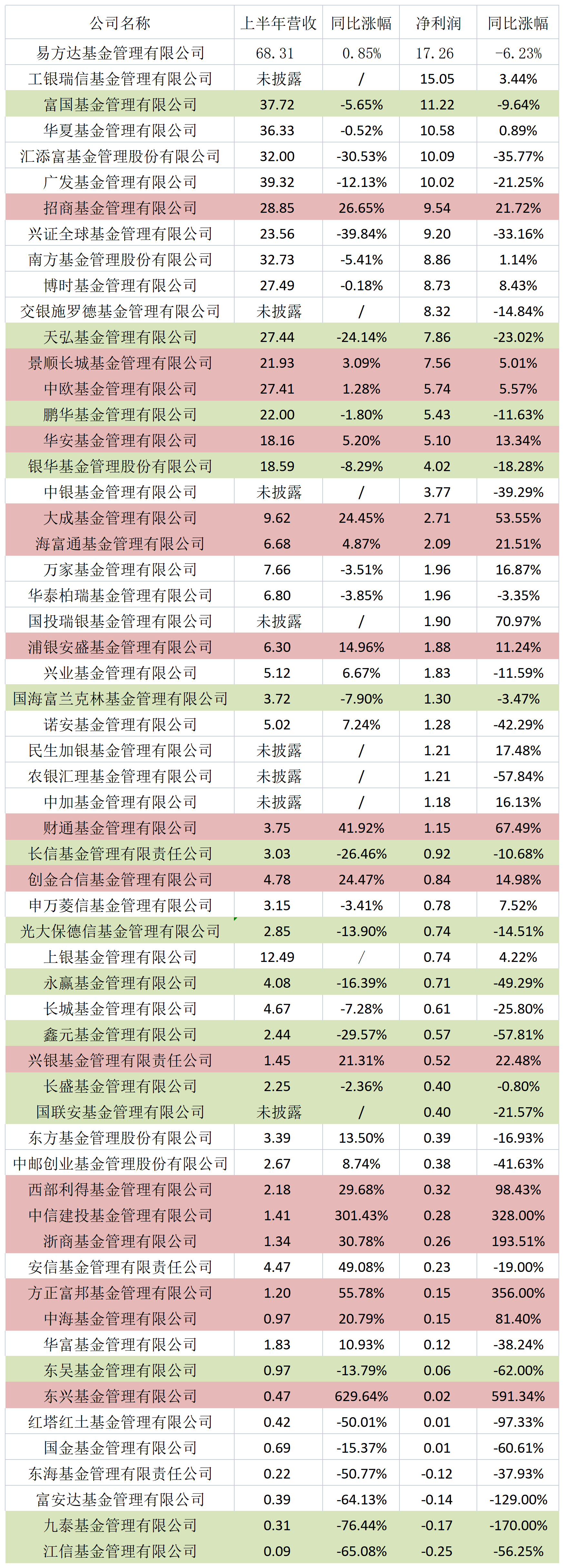 具体来看,今年上半年仅有6家基金公司的上半年净利润破10亿。分别是易方达、工银瑞信、富国、华夏、汇添富、广发。