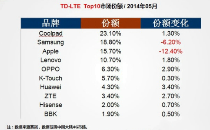 彼时,酷派与中兴、华为、联想被称为“中华酷联”,成为了国产机市场的四大霸主之一。2012年,酷派在国内手机市场拥有11%的市占率,这一份额在2014年5月上升至23.1%,酷派也成功力压三星和苹果,登上了国内手机市场的榜首。