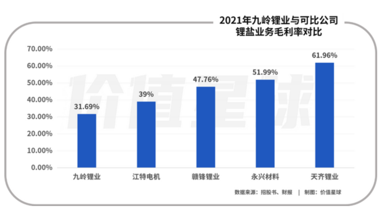 从锂盐毛利率来看,2021年度,碳酸锂等原料价格的飞涨让全行业从中受益。2021年,天齐锂业的毛利率为61.96%、赣锋锂业为47.76%,九岭锂业只有31.69%,并不具备明显优势。