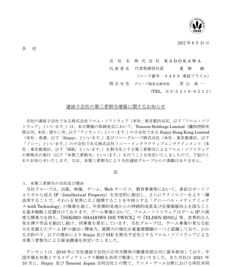 日本角川集团(KADOKAWA)8月31日宣布,合并子公司FromSoftware将通过第三方配售的方式向腾讯控股旗下游戏公司Sixjoy Hong Kong和索尼互动娱乐有限公司(SIE)发行新股。
