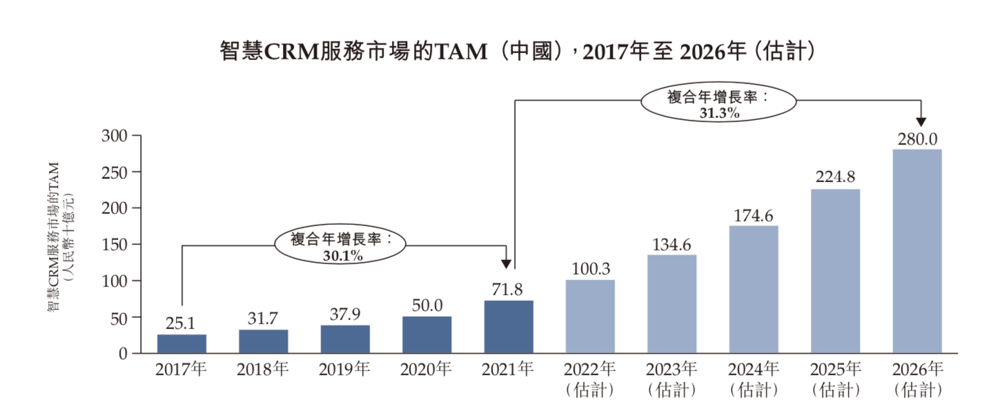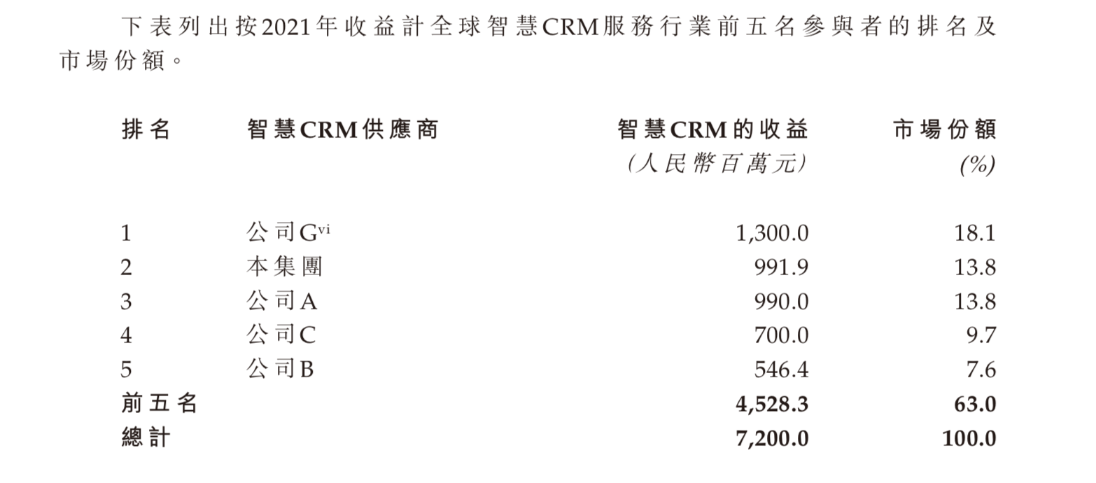 从玄武云招股书中引述的行业报告来看,中国CRM服务行业高度集中,按2021年收入计,前五名参与者的市场份额合计为63%,玄武云处于行业龙头地位;按2021年国内本土智慧CRM服务供应商收入计,玄武云是中国国内最大的智慧CRM服务供应商,市场份额为13.8%,这给玄武云挣来了“国内智慧CRM第一股”的名号。