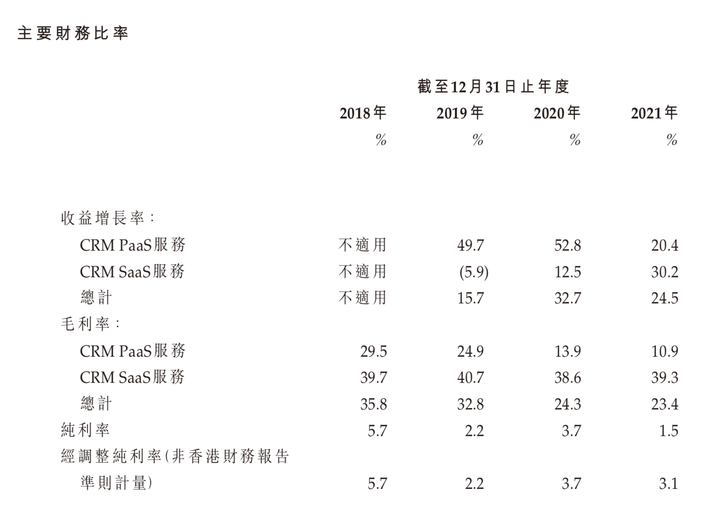 2018-2021四年报告期内,玄武云来自CRMPaaS服务的收益占同期收益的38.8%、50.2%、57.8%及55.9%,超越了SaaS业务,占到总收入的半壁江山。而这部分业务的毛利率在报告期内分别为29.5%、24.9%、13.9%、10.9%,远低于SaaS厂商毛利平均水平。玄武云的SaaS业务毛利率也远低于同行,2018-2021年分别为39.7%、40.7%、38.6%、39.3%。通常而言,国内SaaS公司毛利率在70%-85%之间,平均水平75%,超过82%被视作顶尖。