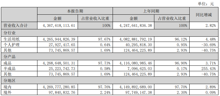 8月30日晚中顺洁柔发布2022年半年报,期内公司实现营业收入43.68亿元,同比增长2.82%;实现归属于上市公司股东的净利润2.28亿元,同比下滑44.09%。