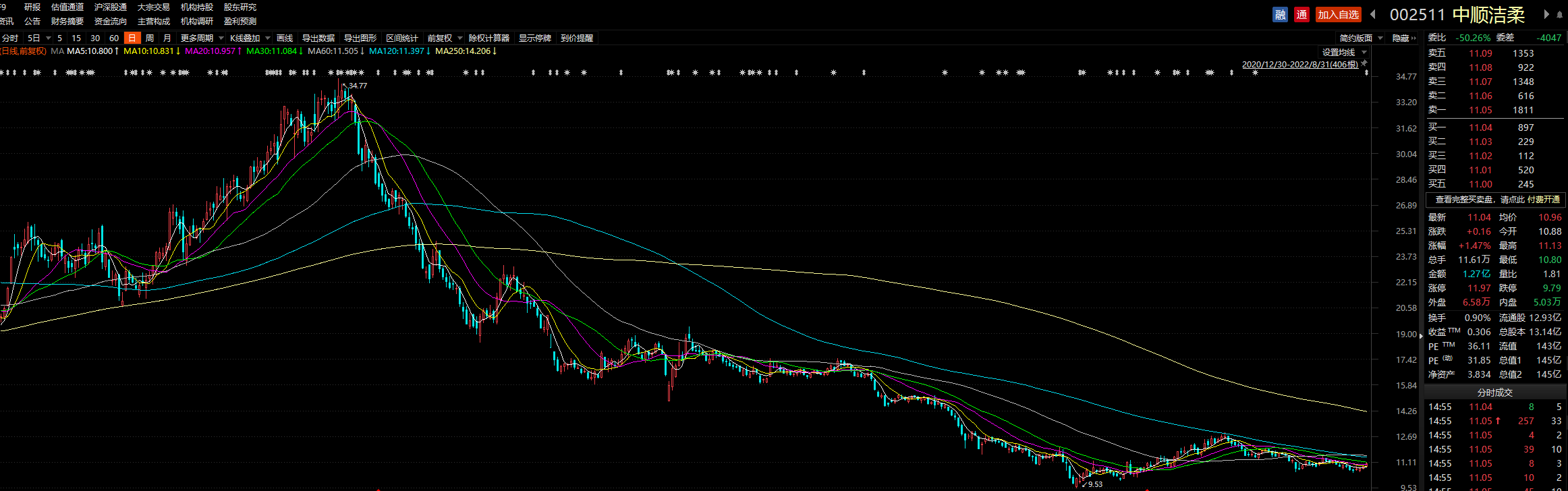股价已反映出市场对中顺洁柔业绩的担忧。自2021年5月公司股价触及34.77元/股的新高后便震荡下行,近期股价于较低位徘徊,最新股价为11.04元/股。