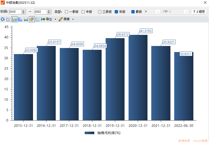 iChoice数据显示,自去年11月以来纸浆价格持续上涨,目前仍处于高位。受此影响,中顺洁柔毛利率持续走低。今年上半年公司毛利率为32.93%,已是2016年以来的新低。