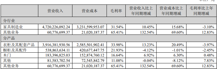 索菲亚表示衣柜产品毛利率下滑原因有三:一是大宗业务定制衣柜产品毛利率较上年同期大幅度下降;二是受板材、装饰纸、包材等原材料价格上升,以及宏观经济环境的影响,定制衣柜毛利率较上年同期下降;三是配套产品家具家品收入占整体收入比例提升,家具家品毛利率较定制产品低,拉低定制衣柜及其配套产品毛利率。