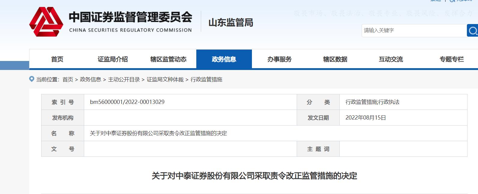 山东证监局指出,中泰证券内部控制不完善,决定对其采取责令改正的监督管理措施,要求其加强债券业务的内控管理,并于8月25日前完成整改并提交整改报告。