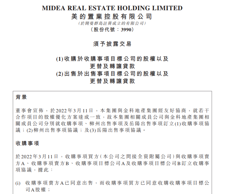 3月11日,美的置业公告称,将收购金科股份南京的两个项目,代价9.07亿元,其中包括4.97亿元的债务接管,即美的置业最终实付金额为4.1亿元。