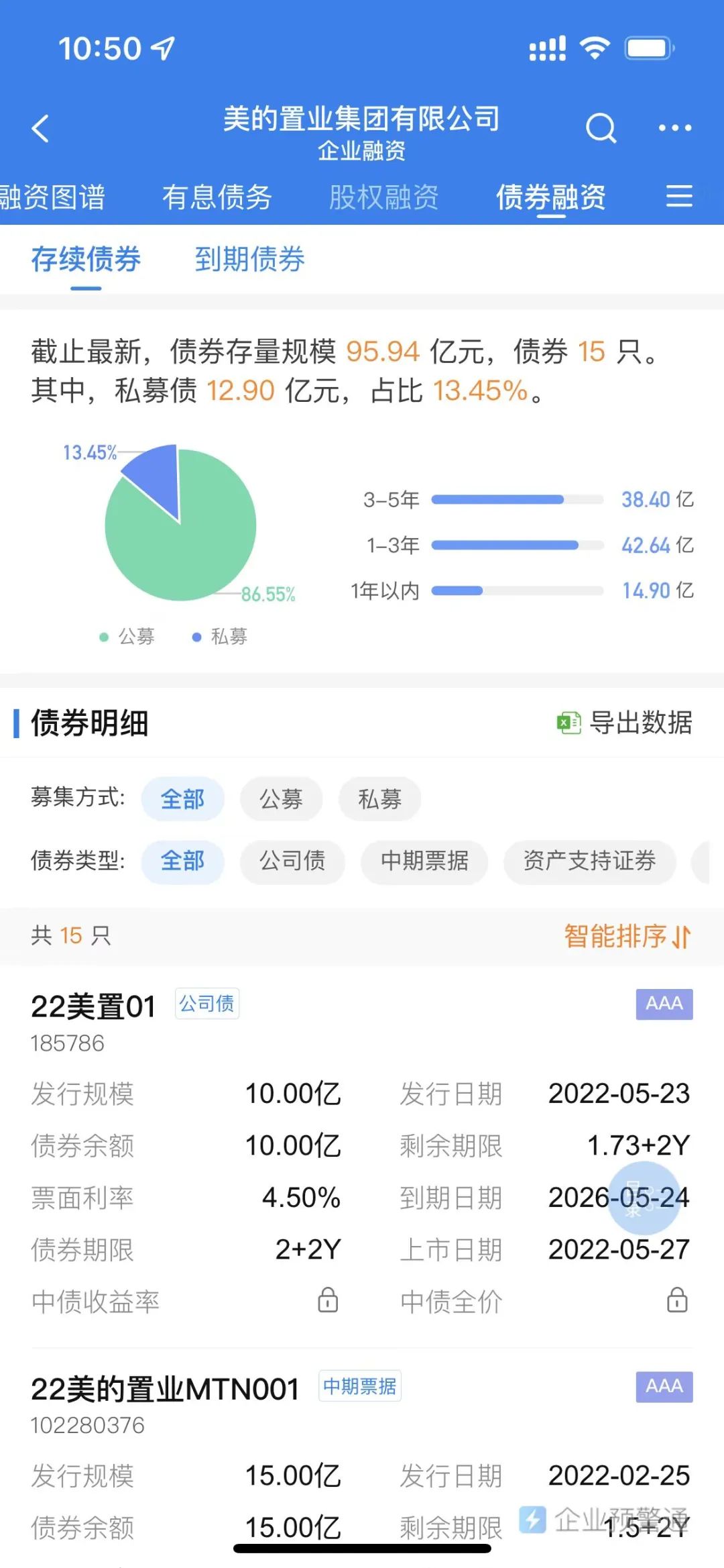 企业预警通显示,美的置业目前共有15只存续债券,总规模95.94亿元,其中14.9亿元将于1年内到期。