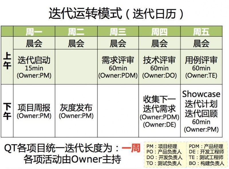 上图就是一个完整的周迭代模型,从中我们可以看到,日历中规定了迭代期限为一周,并在每一个活动上安排专业人员负责组织实施,达到各司其职,共同负责的效果。