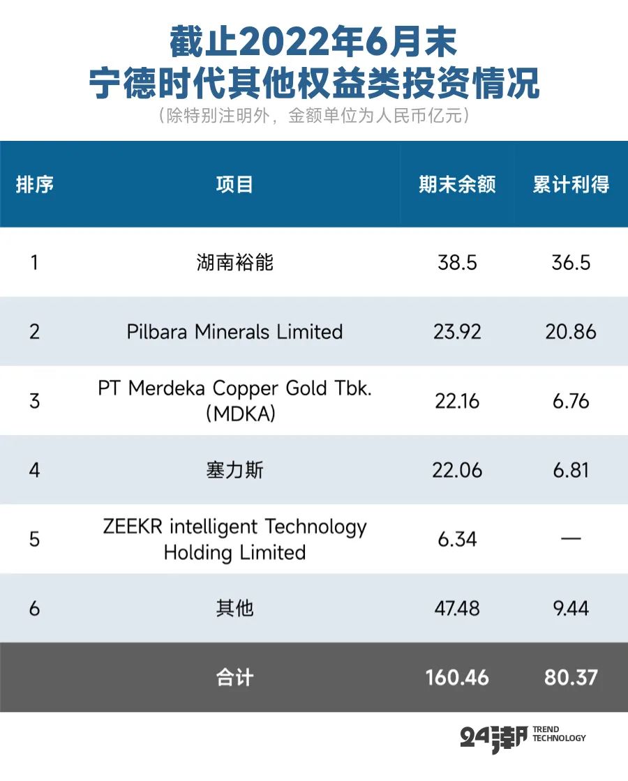 根据财报披露,截止2022年6月末宁德时代 “其他权益类投资” 累计利得达80.37亿元。