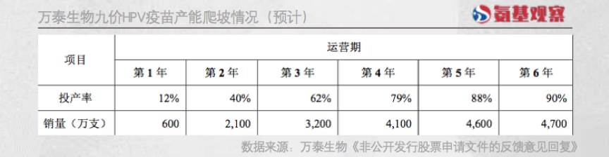 万泰生物在其定增问询回复函中便表示,九价疫苗产业化基地运营期第一年投产率只能达到12%,经过6年时间才能爬坡至90%。