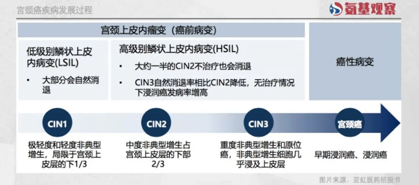 HPV持续感染,首先会导致低级别鳞状上皮内病病变,接着进阶到高级别鳞状上皮内病变,最后才有可能演变成宫颈癌。因为这一周期过长(超过10年时间),因此CIN2+病变成了替代标准。