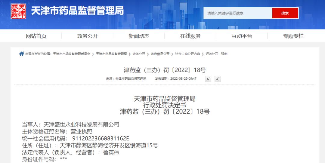 处罚书显示,天津盛世永业生产后未实际销售,在案发后已主动销毁涉案产品的外包材,并对所有标注“孕妇适用”的相关88个品种进行主动注销。