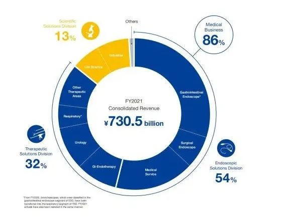 奥林巴斯2021财年的数据显示,7305亿日元中,医疗领域收入占比高达86%。