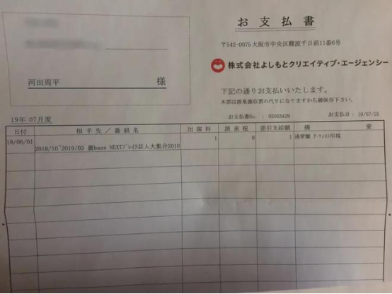 曾经一位日本搞笑艺人在网上晒出工资单,演出费只有1日元(约合人民币5分钱)。