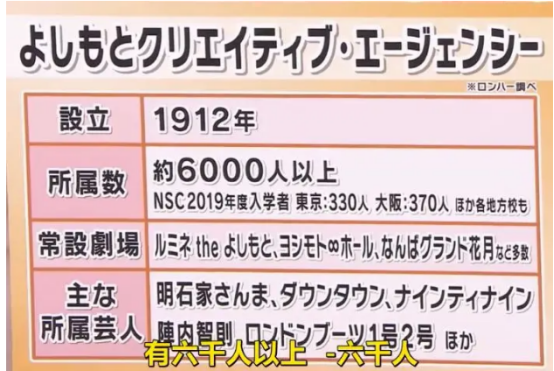 吉本兴业是日本最大的演艺事务所、制作公司之一,总部位于大阪,旗下搞笑艺人有500多位,加上全部的工作人员则有6000人之多。