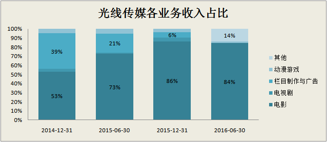 数据显示这家公司正在摆脱电视剧、综艺栏目制作等业务,集中发力于电影板块。半年报中披露,上半年光线传媒并没有电视剧和综艺栏目制作的收入。