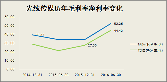 光线传媒的电影板块在上半年出现了爆发式的增长。其中,电影行业的收入为6.08亿元,相较于去年同期3亿元的票房,收入已翻倍。此外,最令人诧异的是由此带来的高毛利和净利润。数据显示,受到高票房的带动,2016年上半年度的毛利率高达52%,比往年33%左右的毛利率高出不少。此外,净利率也是水涨船高,一路从2015年的27%上升至2016年上半年的44%。