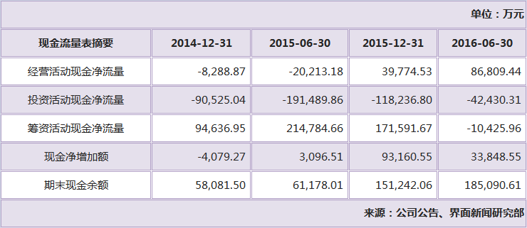 光线传媒为此支付的15.83亿元现金尚未在2016年半年报的报表中体现。在2016年上半年产生现金流的仅有向浙江齐聚增资的1.3亿元,另外的五笔均将体现在2016年下半年的报表中。可以肯定的是,这些并购会让光线传媒在下半年的现金流上承压不小。对此光线传媒采取了发行短期以及超短期的债券来缓解压力。6月25日,光线传媒分别发行了10亿和20亿的短期和超短期票据,来弥补收购猫眼带来的资金缺口。