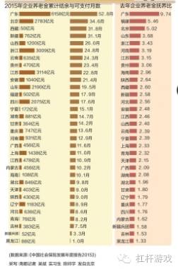 图1.2015年各省区市城镇职工养老金累积结余与可支付月数、抚养比 图片来源|南方都市报