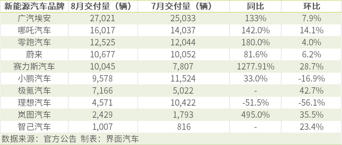界面新闻统计发现,8月新势力交付数据分化明显,仅5家品牌交付量破万,广汽埃安以27021辆持续领跑第一,赛力斯汽车交付量首次破万。