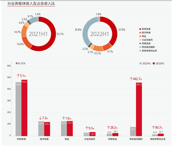 供应链及国际业务占顺丰控股总营收比例达到35.8%,2021年同期占比只有10%不到。