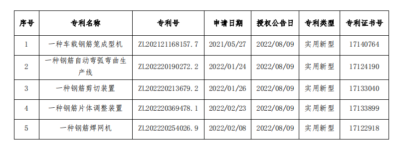 建科机械9月1日公告,公司于近日收到中华人民共和国国家知识产权局颁发的五项实用新型专利证书,并取得三项国际商标续展注册证明。