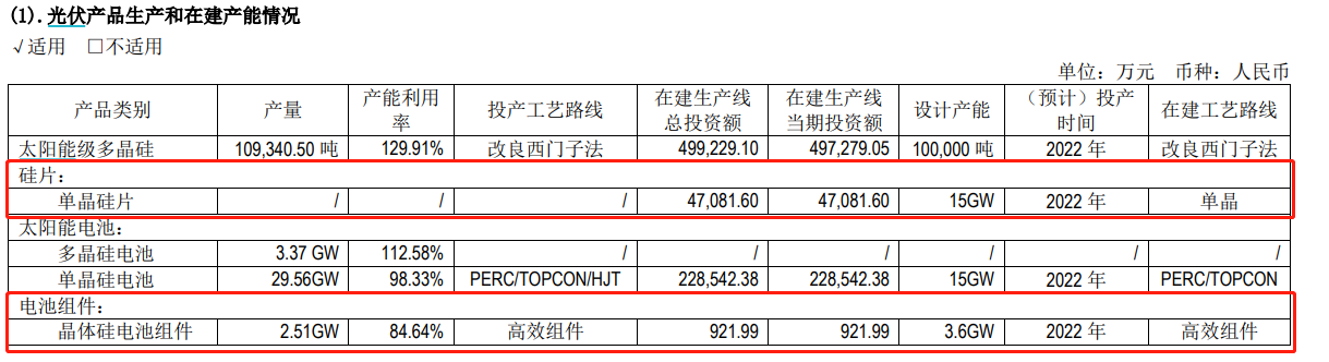 除了组件,通威股份还切入了硅片环节。根据公司2021年年报显示,彼时有设计15GW的硅片产能在建,预计投产时间为今年。此外,公司还有设计3.6GW产能的高效组件在建,投产时间同样为今年。至此,公司已全面进入光伏全产业链。