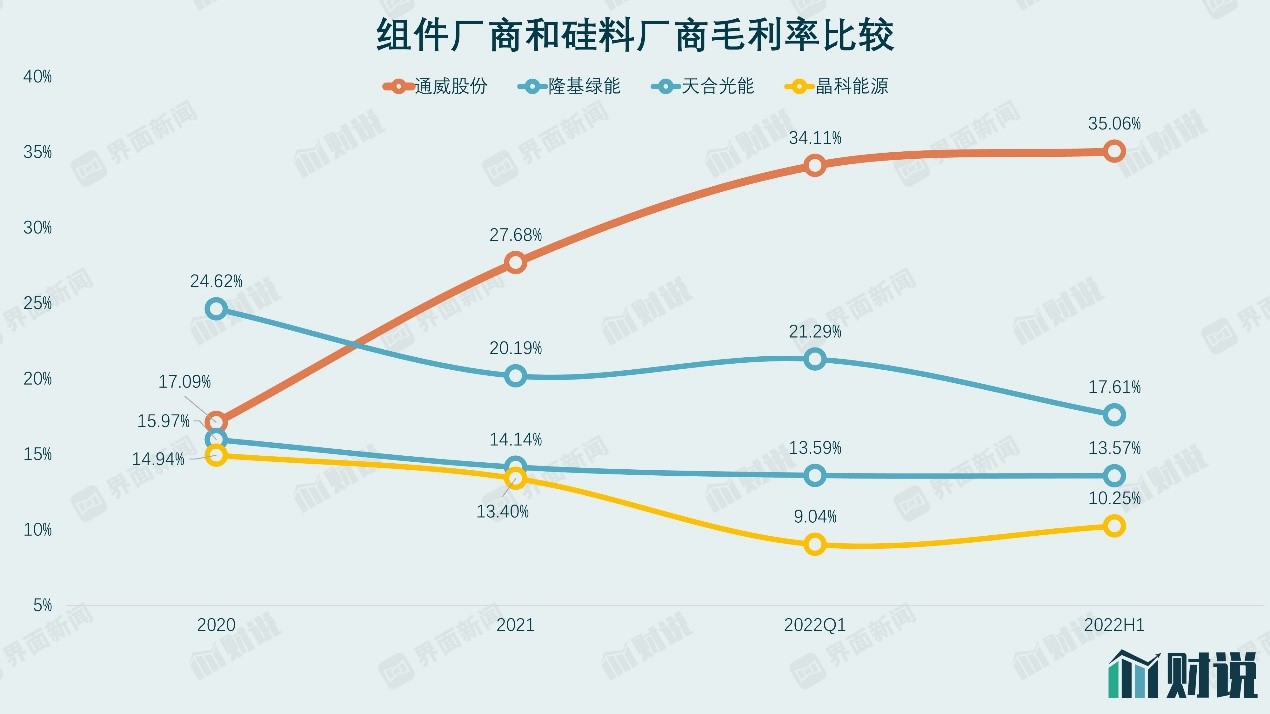 三大组件厂商晶科能源(688223.SH)、天合光能(688599.SH)和隆基绿能毛利率由2020年的14.94%、15.97%和24.62%下滑至今年上半年的10.25%、13.57%和17.61%,下滑幅度高达31.39%、15%和28.47%。与此同时,通威股份毛利率由17.09%上升至35.06%,增幅高达105%。