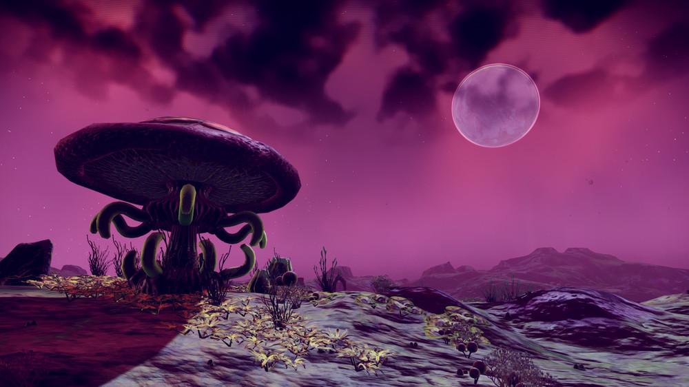 在随机算法下,我们不免会遭遇各式或有趣或奇葩的星球:我曾造访过一颗有着深红色土壤以及蓝色草地的星球,也观测过一颗缭绕着黄色烟雾的气态月亮。有一阵子,我在游戏的地下洞窟中迷了路,不免有些焦虑和沮丧,直到拨开黑暗,洞窟尽头出现一座数百英尺高的石制教堂样式的山体,缭绕着萤火虫,这种感觉完全难以言表。此外,我还曾在一颗遍布水体的星球里游了泳。