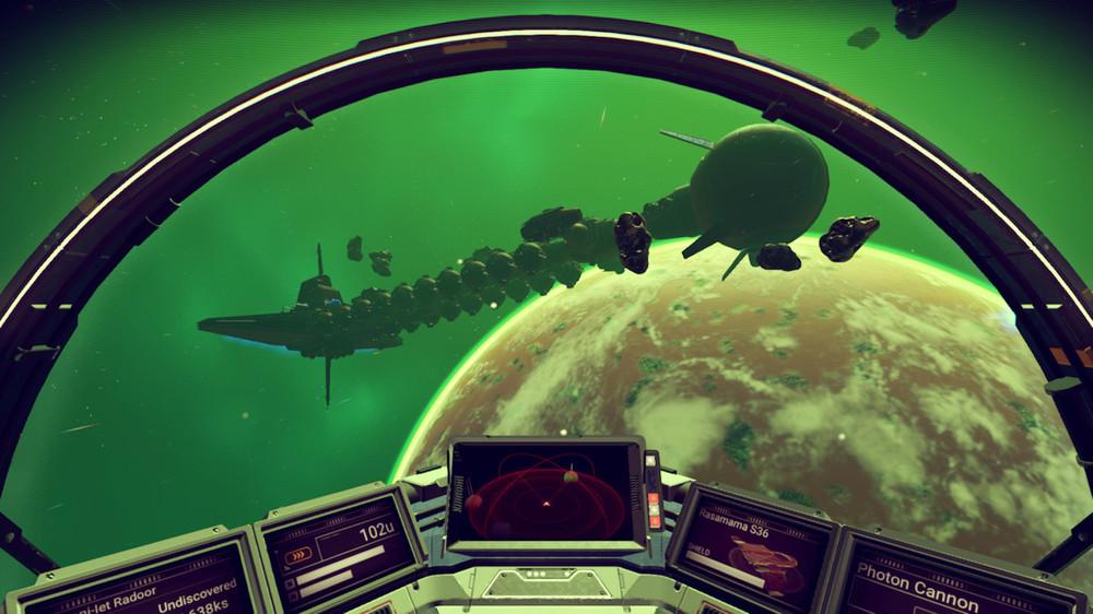 于是,本月我们迎来了《无人深空》,一款由位于英国吉尔福德的小团队Hello Games开发的作品。它提出了一个极为吸引人的概念:由算法生成游戏中你目所能及的所有星球,然后再把玩家随机丢到其中一个,这些星球数量之巨,甚至远超过往。对新涌入的玩家而言也足够惊叹了,在把飞船修好并加满燃料后,他们终将可以亲自体验这种奇妙的宇宙冒险。导航地图上跳出一个新的待探索星球,然后接着是下一个、下一个,以及再下一个……