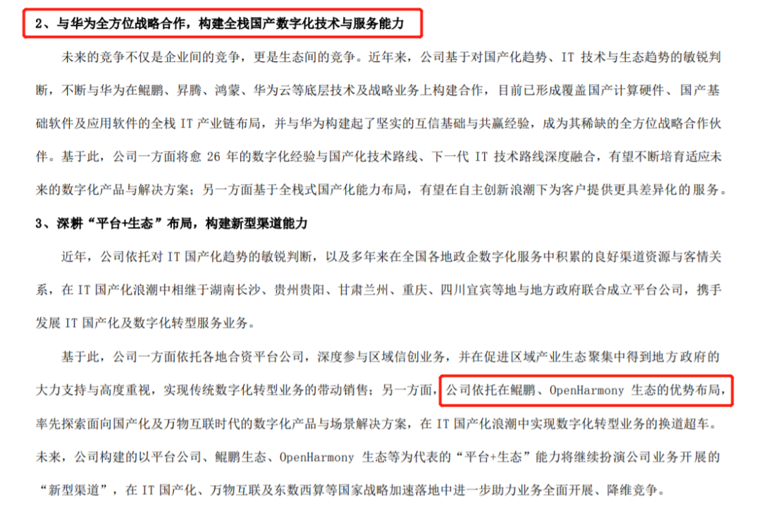 不仅如此,在半年报核心竞争力分析中,拓维信息一共提了三条。其中第二条便是“与华为全方位战略合作,构建全栈国产数字化技术与服务能力”;第三条提到的深耕“平台+生态”布局,也着重指出鲲鹏生态、OpenHarmony生态。