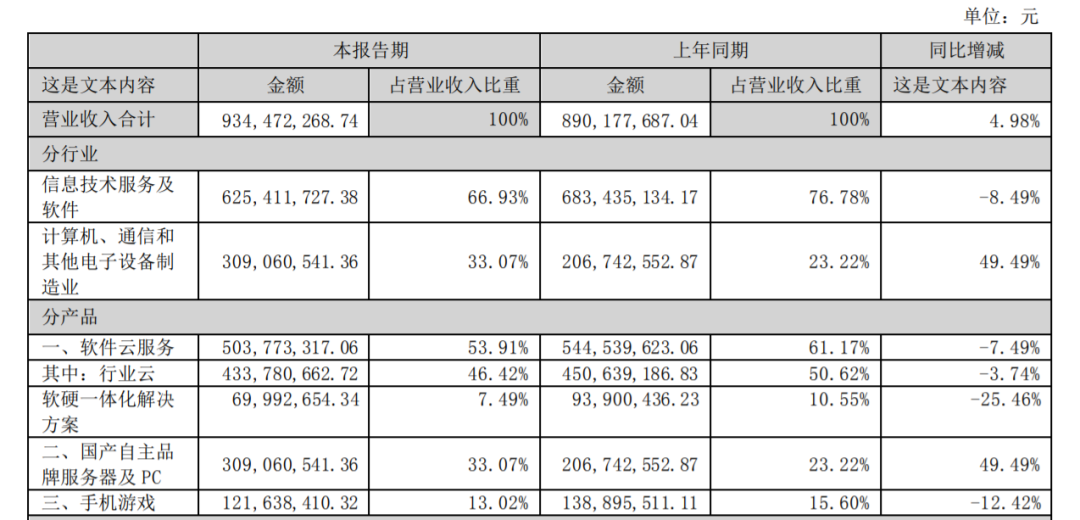 报告期内,“软件云服务”营收为5.04亿元,营收占比为53.9%,依然是主要的收入来源,但这项业务同比下滑了7.49%。其中,行业云服务收入4.34亿元,同比微降3.74%;软硬一体化解决方案业务上半年收入6999.27万元,同比下滑25.46%,占比进一步萎缩至7.5%。