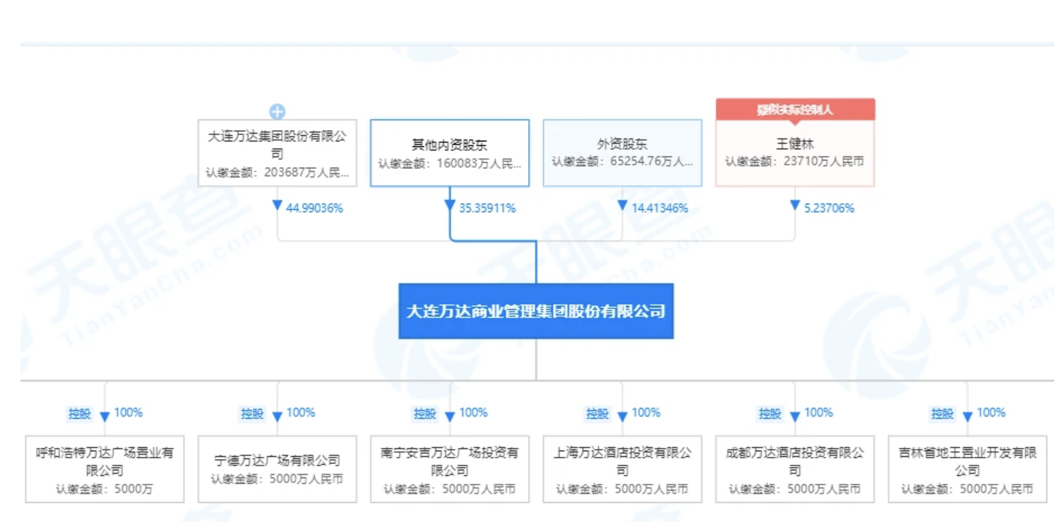 天眼查显示,大连万达集团 持有万达商管44.99%股权,王健林直接持有万达商管5.24%股权,王健林也是万达商管实控人。