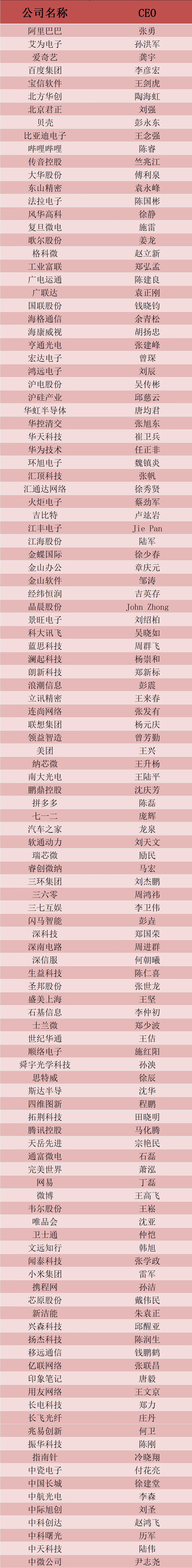 界面新闻2022年度科技行业CEO入围名单(入围125人,按公司名称排序):