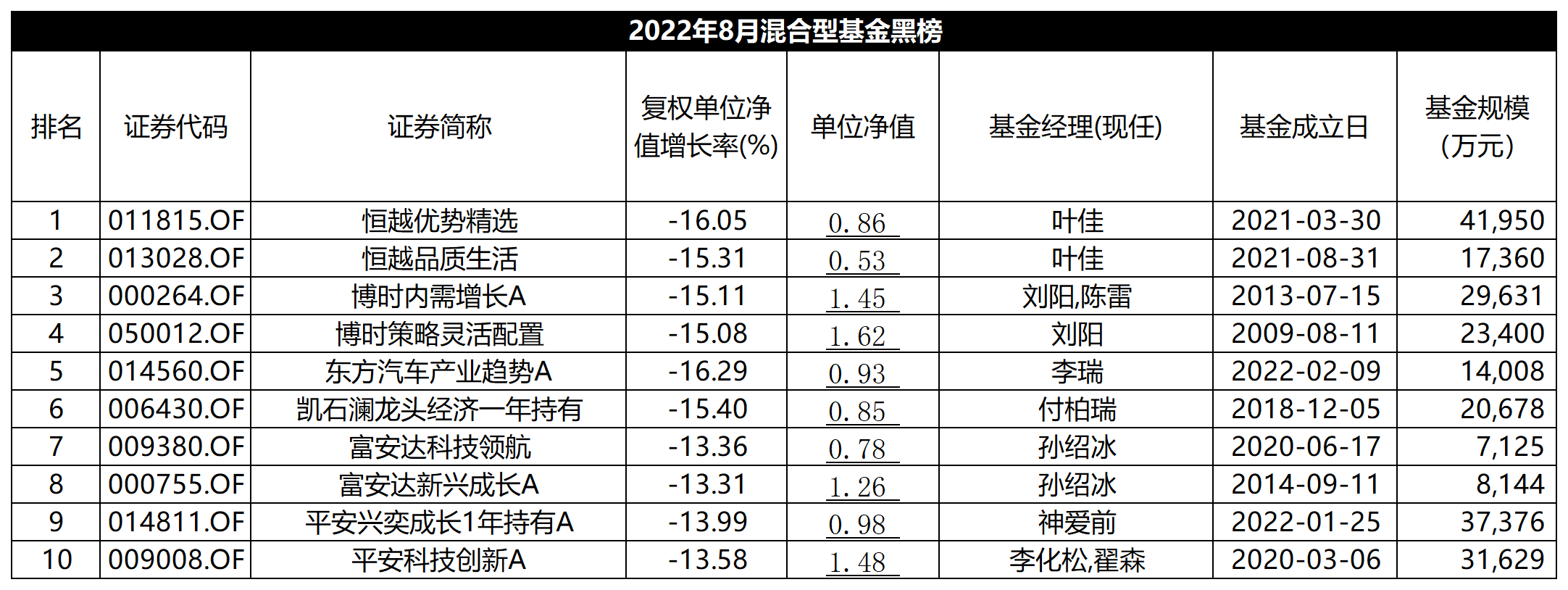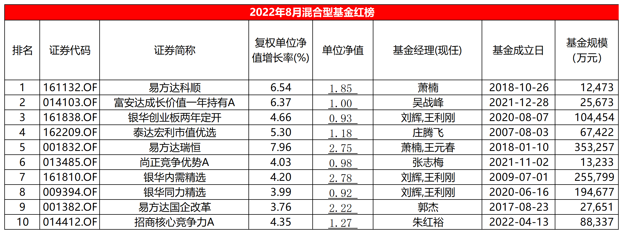 界面新闻综合收益率、波动率、择时与选股等维度对混合型基金(偏股、平衡、灵活)进行了评估,同时对上榜基金进一步筛选,剔除资产规模合计低于五千万,以及成立时间不超过一个月的基金,并排除非投资收益原因造成的净值上涨,整理形成八月份红黑榜。
